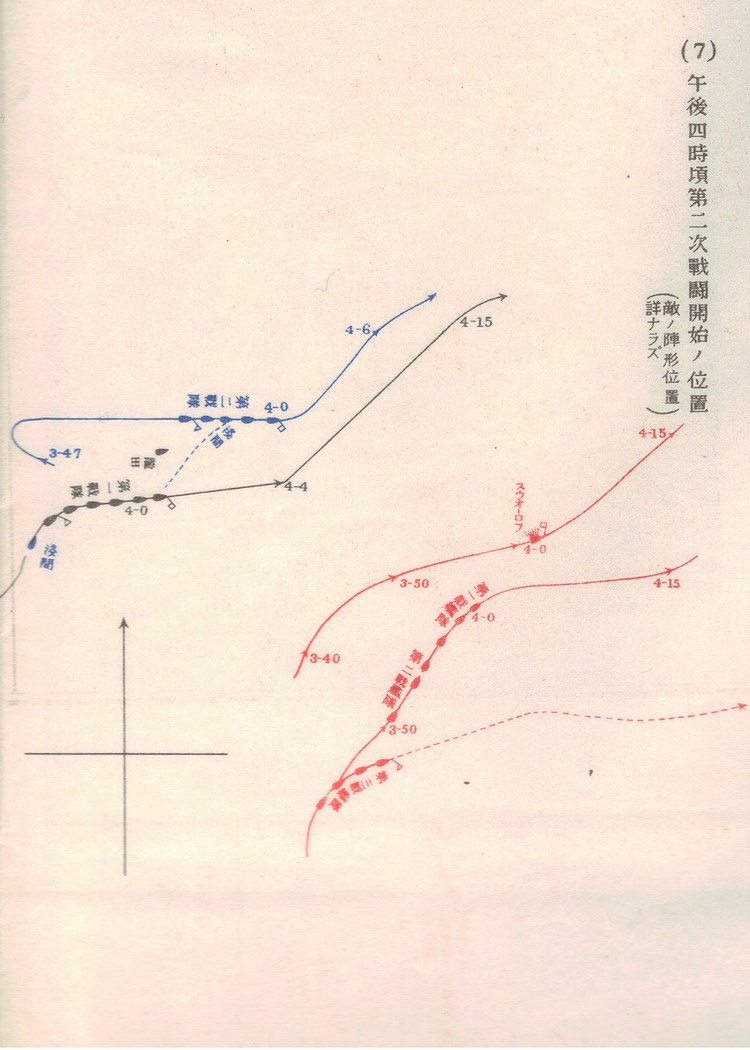 ここに於て第一戦隊もまた一斉に右十六点に回頭し、第二戦隊これに次ぎ、遁ぐるを追て益々敗敵を掩撃し、時々機を見て水雷発射をも試み、午後四時四十五分頃に至るまで、主隊の戦闘に就ては別に著しき現象無く、始終敵を南方に圧して砲撃を継続したるに過ぎず、ただこの間壮烈事蹟として特筆すべきは、午後三時四十分の頃、千早及び第五駆逐隊が、並びに午後四時四十五分の頃第四駆逐隊が、敵の廃艦「スウオーロフ」に対し勇敢なる水雷攻撃を決行したることにて、前者の奏功は確実ならざりしも、後者より発せし一水雷は敵艦の左舷後部に命中し、須臾にして艦体十度計り傾斜するを見たり。この両回の襲撃中、第五駆逐隊の不知火、及び第四駆逐隊の朝潮は、附近敵艦より猛射せられ、共に一弾を受けて一時危殆に陥りしも、幸にして遂に無事なることを得たり。