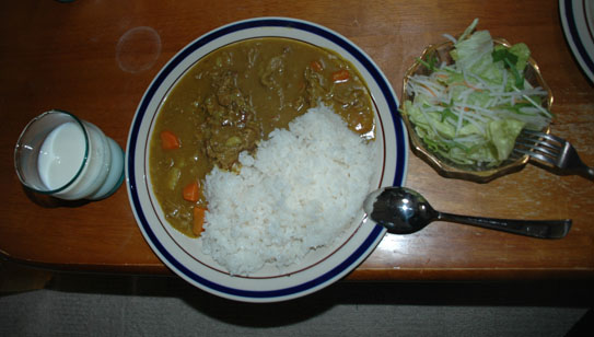 I ごはんを皿に盛り、カレーをかけて出来上がり♪ もちろん、野菜サラダと牛乳も一緒に。