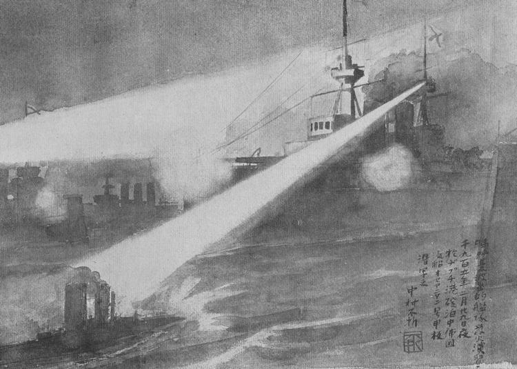 ジブチ港に於けるバルチック艦隊の夜間演習(中村不折画)