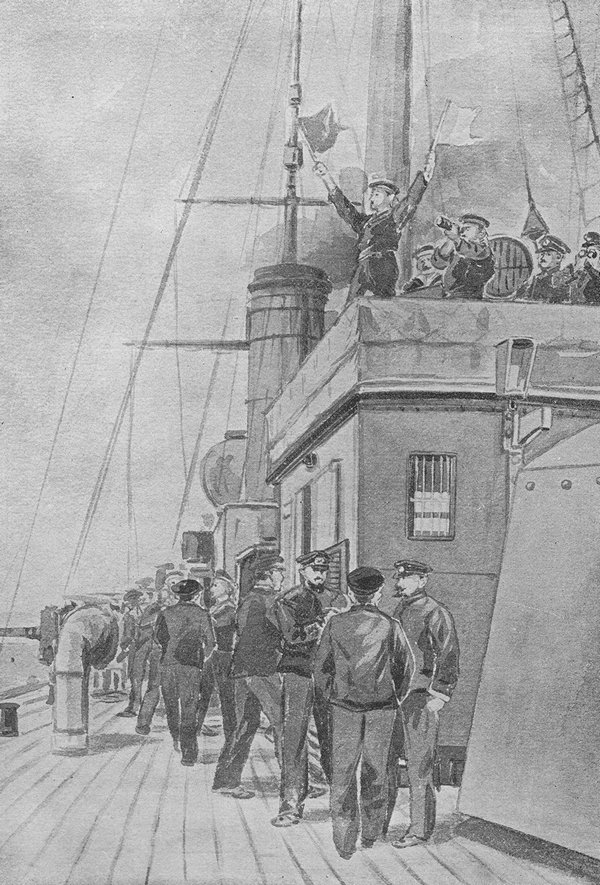 その様子を甲板上で描き上げて帰国後に日露戦争写真画報に寄稿した。